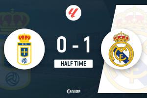 上半場(chǎng)補(bǔ)時(shí)2分鐘,皇家奧維耶多0-1皇馬。