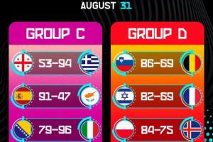 體育資訊09月01日訊 男籃歐錦賽當(dāng)?shù)貢r(shí)間8月31日的6場(chǎng)小組賽全部結(jié)束,詳細(xì)賽果如下: