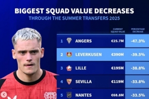 體育資訊9月7日訊 《轉(zhuǎn)會(huì)市場》統(tǒng)計(jì)了今夏轉(zhuǎn)會(huì)窗過后的總身價(jià)下降比例情況,昂熱居首,法甲7隊(duì)在列。