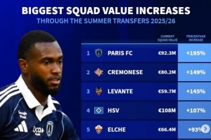 體育資訊9月7日訊 《轉(zhuǎn)會(huì)市場(chǎng)》統(tǒng)計(jì)了今夏轉(zhuǎn)會(huì)窗過(guò)后的總身價(jià)上升比例情況,多家升班馬霸榜。
