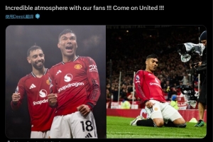 卡塞米羅曬出自己的賽場照,并配文:球迷們營造的氛圍簡直太棒了?。?!加油曼聯(lián)!?。?/p>