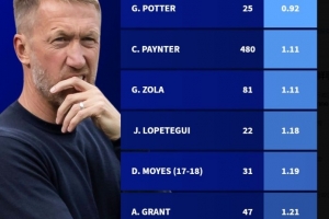 體育資訊9月21日訊 英超第5輪比賽,西漢姆聯(lián)在主場以1-2的比分不敵水晶宮,格拉漢姆-波特遭遇下課危機(jī)。根據(jù)數(shù)據(jù)統(tǒng)計(jì),波特是西漢姆聯(lián)隊(duì)史拿分率最低的主教練,場均僅能拿到0.92分。