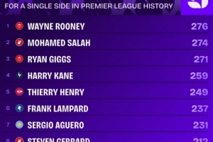 體育資訊9月21日訊 Squawka統(tǒng)計(jì)了球員在單一球隊(duì)參與英超進(jìn)球的數(shù)量,并列出榜單,薩拉赫參與274球排名第二位,距離首位魯尼僅差2球。