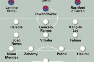 巴薩:什琴斯尼;孔德、庫巴西、加西亞、馬??;佩德里、德容、奧爾莫;亞馬爾、萊萬、拉什福德或費蘭-托雷斯