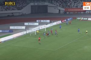 判例三:中甲聯(lián)賽第24輪,蘇州東吳vs南京城市。比賽第48分鐘,蘇州東吳6號隊(duì)員頭球射門,南京城市守門員將球撲出,助理裁判員示意球的整體已經(jīng)越過球門線,裁判員判蘇州東吳隊(duì)進(jìn)球得分。