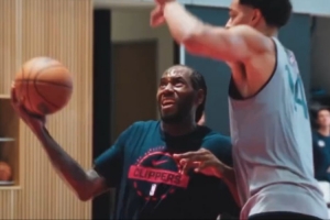 保羅、萊昂納德、哈登、祖巴茨和比爾合體進(jìn)行隊(duì)內(nèi)訓(xùn)練,萊昂納德迎著防守強(qiáng)硬上籃打進(jìn)。
