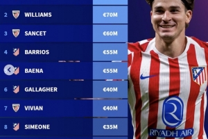 體育資訊10月3日訊 西甲球員身價更新,德轉(zhuǎn)列出西甲非皇馬和巴薩球員的身價前十,阿爾瓦雷斯1億歐第一。