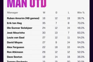 對(duì)陣桑德蘭的比賽將是阿莫林執(zhí)教曼聯(lián)的第50場(chǎng)比賽,但他的5位前任莫耶斯、范加爾、穆里尼奧、索爾斯克亞和滕哈赫,都沒能在執(zhí)教曼聯(lián)的50場(chǎng)里程碑取得勝利。