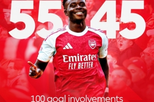 英超官方社媒曬海報向薩卡表示祝賀,并配文寫道:薩卡在英超聯(lián)賽中參與進(jìn)球數(shù)突破100個??