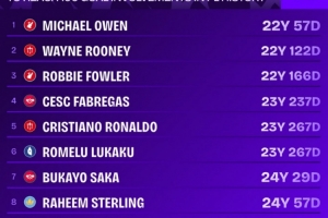 體育資訊10月5日訊 英超第7輪比賽,薩卡點(diǎn)射破門,幫助阿森納主場2-0擊敗西漢姆,薩卡成為達(dá)成英超參與100球第7年輕的球員。