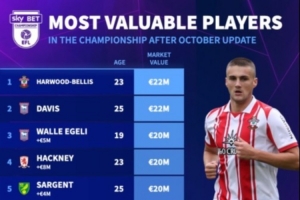 體育資訊10月6日訊 德轉(zhuǎn)更新英冠球員身價,在目前的英冠球員身價中,南安普頓球員貝利斯和伊鎮(zhèn)球員戴維斯2200萬歐并列第一。
