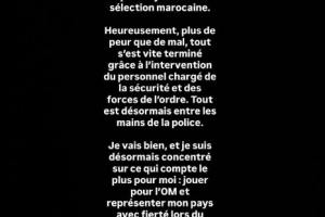 “幸運(yùn)的是,驚嚇大于傷害,事件在安保人員和執(zhí)法部門的及時(shí)介入下迅速平息。目前一切已交由警方處理。我現(xiàn)在很好,也已將注意力重新放在最重要的事情上:為馬賽效力,并在即將到來的國(guó)家隊(duì)集訓(xùn)中自豪地代表祖國(guó)出戰(zhàn)。”