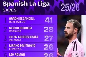 體育資訊10月7日訊 日前,Squawka統(tǒng)計(jì)了本賽季西甲撲救次數(shù)排行,皇家奧維耶多門將埃斯坎德爾以41次撲救居首。