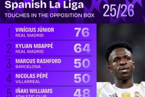 西甲禁區(qū)觸球數(shù)排行:維尼修斯76次居首 姆巴佩第2、拉什福德第3