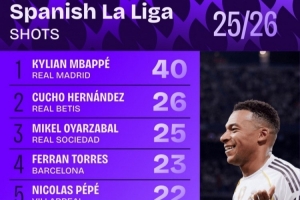 體育資訊10月7日訊 日前,Squawka統(tǒng)計(jì)了本賽季西甲射門(mén)次數(shù)排行,姆巴佩以40次射門(mén)居首。
