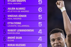 西甲射手榜:姆巴佩9球居首 阿爾瓦雷斯第二、維尼修斯第三