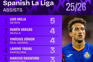 西甲助攻榜:維尼修斯并列第2 亞馬爾、拉什福德、居勒爾并列第4