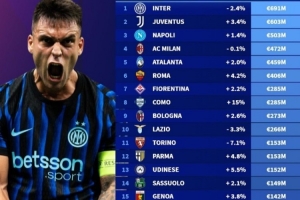 意甲俱樂(lè)部陣容身價(jià)排名:國(guó)米6.91億歐元第一,科莫2.85億歐第八