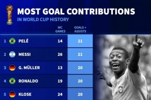 體育資訊10月8日訊 德國轉(zhuǎn)會市場統(tǒng)計了球員在世界杯(決賽圈階段)參與進球的數(shù)量,并列出榜單,貝利、梅西參與21球并列居首。