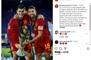 莫拉塔社媒曬出與阿爾巴在西班牙隊(duì)的合照,并寫道:“與你并肩作戰(zhàn)、共享歡樂的時(shí)光何其珍貴,你總是充滿快樂,旅途餐桌上歡聲笑語(yǔ)不斷。你是足球歷史上最杰出的球員之一?!?/p>