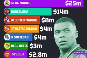 體育資訊10月8日訊 Sponsorlytix統(tǒng)計(jì)了西甲各隊(duì)每年的衣袖廣告收入,并列出榜單,皇馬2500萬美元居首,巴薩1400萬美元次席。