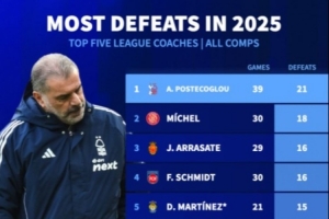體育資訊10月9日訊 接替努諾成為諾丁漢森林主帥后,波斯特科格魯未能提升球隊表現(xiàn),反而讓球隊進一步陷入泥沼。根據德國轉會市場的統(tǒng)計,波斯特科格魯是五大聯(lián)賽今年輸球最多的主教練,達到了21場,而曼聯(lián)主帥阿莫林以15場并列第4。