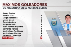 體育資訊10月9日訊 ESPN統(tǒng)計了阿根廷球員在世青賽歷史上的進球數(shù)量,并列出世青賽歷史阿根廷球員射手榜,薩維奧拉11球斷層居首,馬拉多納、梅西、阿圭羅6球,薩爾科本屆賽事打進4球上榜。