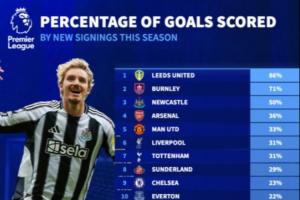 體育資訊10月9日訊 新賽季英超已經(jīng)進(jìn)行了7輪比賽,20支球隊(duì)今夏新援作用如何?德國轉(zhuǎn)會(huì)市場盤點(diǎn)了各隊(duì)新援進(jìn)球數(shù)占球隊(duì)總進(jìn)球數(shù)的比例情況,其中利茲聯(lián)86%最高,阿森納、曼聯(lián)、利物浦分列位居第4、第5和第6。