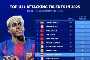 2025年五大聯(lián)賽U21參與進球榜:亞馬爾32球居首,杜埃26球次席