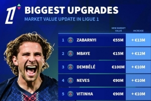 體育資訊10月12日訊 德國(guó)轉(zhuǎn)會(huì)市場(chǎng)更新法甲球員的身價(jià),并列出身價(jià)上漲榜單,扎巴爾尼+1300萬(wàn)歐居首,巴黎球員占據(jù)前7名。