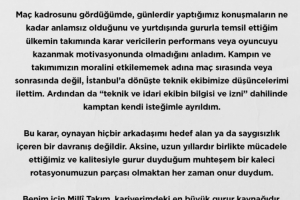 當(dāng)看到比賽名單時,我才意識到這些天來的溝通毫無意義——那些在海外為國爭光的球員,在國家隊決策者眼中,其表現(xiàn)和斗志根本不被重視。為避免影響集訓(xùn)營和球隊士氣,我選擇在返回伊斯坦布爾后向技術(shù)團隊傳達了我的想法,而非在比賽期間或賽后,隨后在‘技術(shù)和管理團隊知情并同意’的情況下,我自愿離開了集訓(xùn)營。