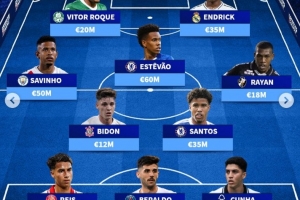 中場(chǎng):布雷諾-比頓(科林蒂安,1200萬(wàn)歐)、安德烈-桑托斯(切爾西,3500萬(wàn)歐)、薩維尼奧(曼城,5000萬(wàn)歐)、埃斯特旺(切爾西,6000萬(wàn)歐)、拉揚(yáng)(達(dá)伽馬,1800萬(wàn)歐)