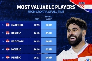 體育資訊10月13日訊 德國(guó)轉(zhuǎn)會(huì)市場(chǎng)統(tǒng)計(jì)了克羅地亞球員的歷史最高身價(jià),并列出克羅地亞球員歷史身價(jià)排名,格瓦迪奧爾8000萬(wàn)歐居首。