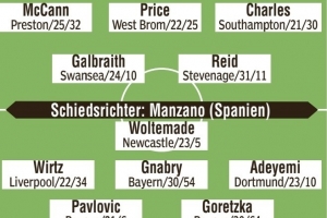 中場(chǎng):斯賓塞(牛津聯(lián))、德文尼(水晶宮)、麥卡恩(普雷斯頓)、普萊斯(西布朗)、查萊斯(南安普頓)