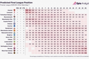 體育資訊10月15日訊 英超七輪過(guò)后,數(shù)據(jù)機(jī)構(gòu)OPTA超級(jí)計(jì)算機(jī)預(yù)測(cè)本賽季英超冠軍↓