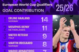 體育資訊10月15日訊 Squawka統(tǒng)計了本屆歐洲世預賽球員參與進球(助攻+進球)的數(shù)量,并列出榜單,哈蘭德參與14球居首,德佩參與11球次席。