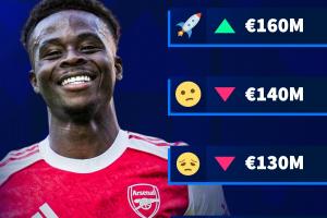 體育資訊10月15日訊 德國足球轉會市場將在10月17日更新英超球員身價,目前德轉已經陸續(xù)放出了一批球員的身價變動進行預熱,阿森納前鋒薩卡位列其中。