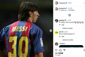 梅西發(fā)布了一張他身穿巴薩30號(hào)球衣的經(jīng)典舊照,并配文寫(xiě)道:“已經(jīng)21年了……難以置信。”