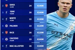 體育資訊10月17日訊 今日德轉(zhuǎn)更新英超身價,其中伊薩克漲至1.4億歐,薩卡跌至1.4億,維爾茨跌至1.3億。