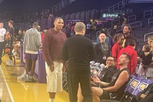 賽前,威少與湖人助教斯科特-布魯克斯交流,兩人曾在雷霆與奇才共事過。