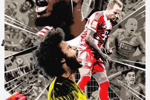 海報(bào)是充滿張力的拼貼畫風(fēng)格,拜仁后衛(wèi)于帕梅卡諾、凱恩一同出鏡,背景還有昔日對決瞬間。