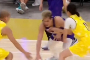 比賽當(dāng)中,郭艾倫與女籃前國(guó)手趙爽拉開(kāi)單挑,一波蝴蝶穿花運(yùn)球甚至晃倒趙爽,隨后躲開(kāi)曹芳干擾上籃打進(jìn)。
