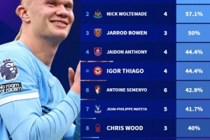 體育資訊10月19日訊 在本輪英超曼城2-0擊敗埃弗頓,哈蘭德梅開(kāi)二度,本賽季英超打進(jìn)11球。德轉(zhuǎn)也盤點(diǎn)了英超單一球員進(jìn)球占全隊(duì)百分比榜單,其中哈蘭德居首,具體如下: