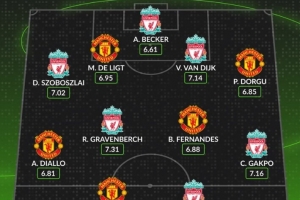 體育資訊10月19日訊 本輪英超將上演曼聯(lián)與利物浦的焦點(diǎn)對(duì)決,數(shù)據(jù)網(wǎng)站W(wǎng)hoscored也盤(pán)點(diǎn)了兩隊(duì)球員本賽季英超場(chǎng)均評(píng)分最高陣容,具體如下: