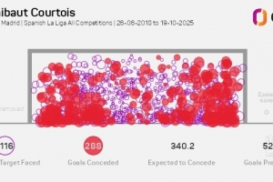 Opta指出,2018-2019賽季庫爾圖瓦加盟皇馬以來,預期失球340.2粒,而去掉烏龍球的實際失球為288粒,這意味著庫爾圖瓦阻止了52.2粒失球,五大聯(lián)賽門將同期最多。