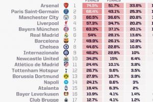 體育資訊10月21日訊 歐冠聯(lián)賽階段第三輪開(kāi)賽在即,opta超級(jí)計(jì)算機(jī)更新了歐冠奪冠概率,其中阿森納位列榜首,巴黎、曼城分列二三。