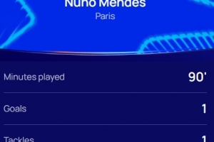 本場比賽努諾-門德斯發(fā)揮出色,傳射建功,7次搶回球權(quán),跑動距離9.6km,賽后他也當(dāng)選歐冠官方評選出的本場最佳球員。