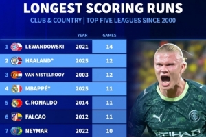 2.哈蘭德,2025年,連續(xù)12場進球(當前紀錄)