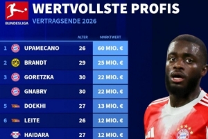 體育資訊10月23日訊 《轉(zhuǎn)會市場》統(tǒng)計了合同將在明夏到期的德甲球員身價情況,拜仁中衛(wèi)于帕梅卡諾獨自領跑。