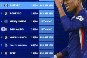 歐冠破門最年輕巴西球員榜:恩德里克居首,埃斯特旺次席